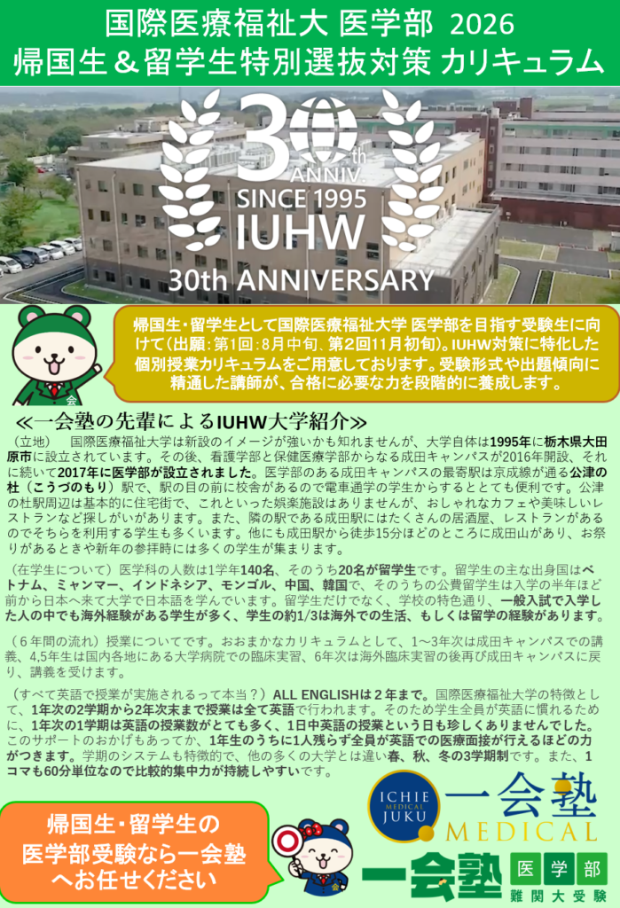 帰国生・留学生として国際医療福祉大学 医学部を目指す受験生に向けて(出願:第1回:8月中旬、第2回11月初旬)。IUHW対策に特化した個別授業カリキュラムをご用意しております。受験形式や出題傾向に精通した講師が、合格に必要な力を段階的に養成します。