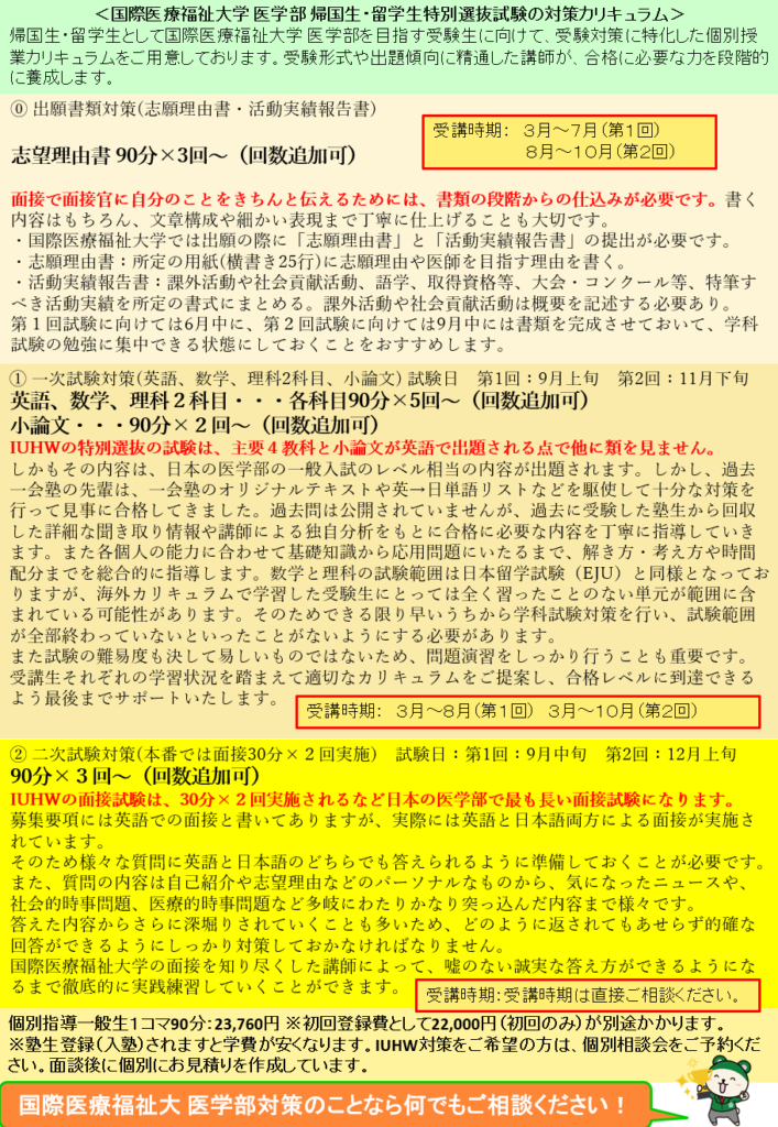 ※塾生登録(入塾)されますと学費が安くなります。IUHW対策をご希望の方は、個別相談会をご予約ください。面談後に個別にお見積りを作成しています。